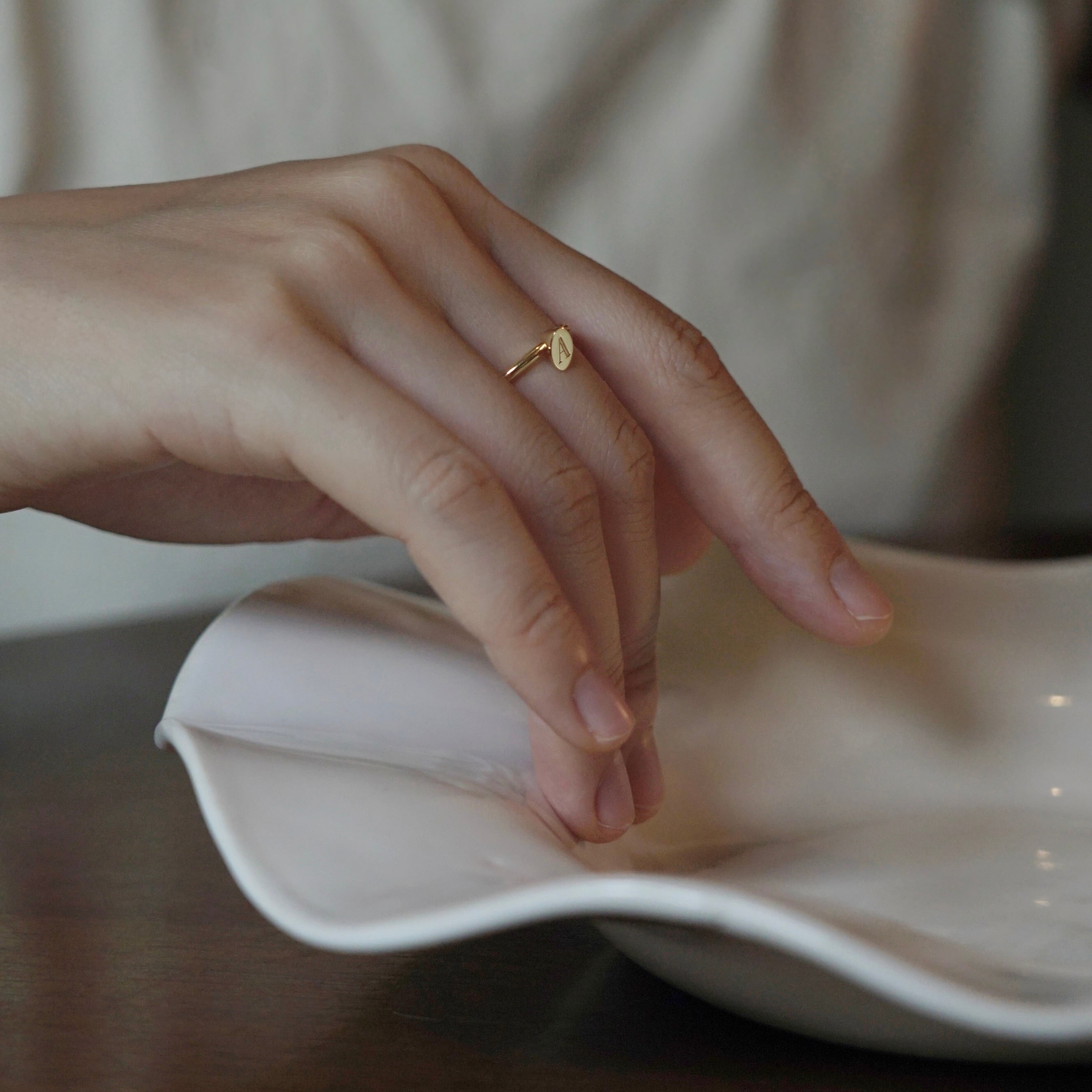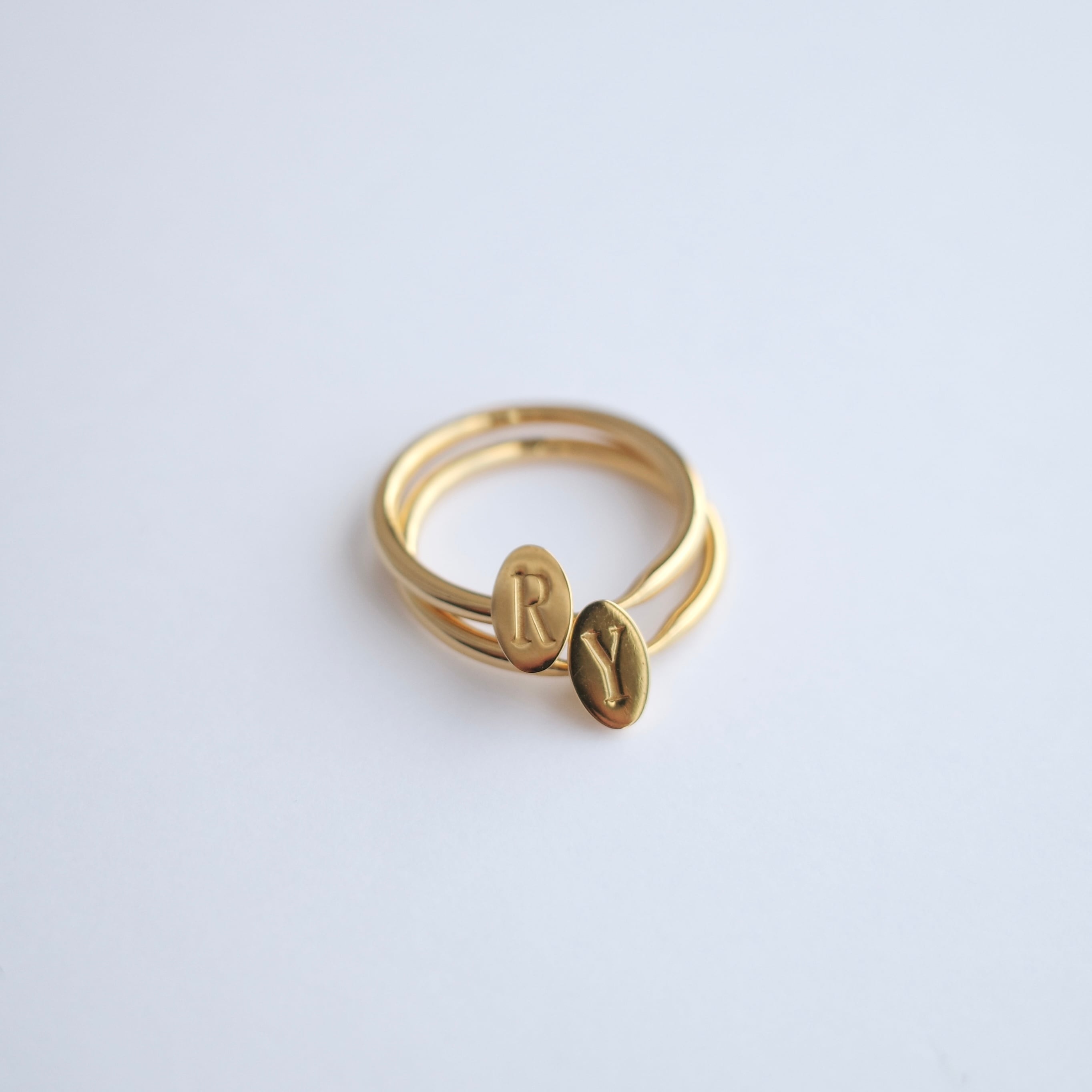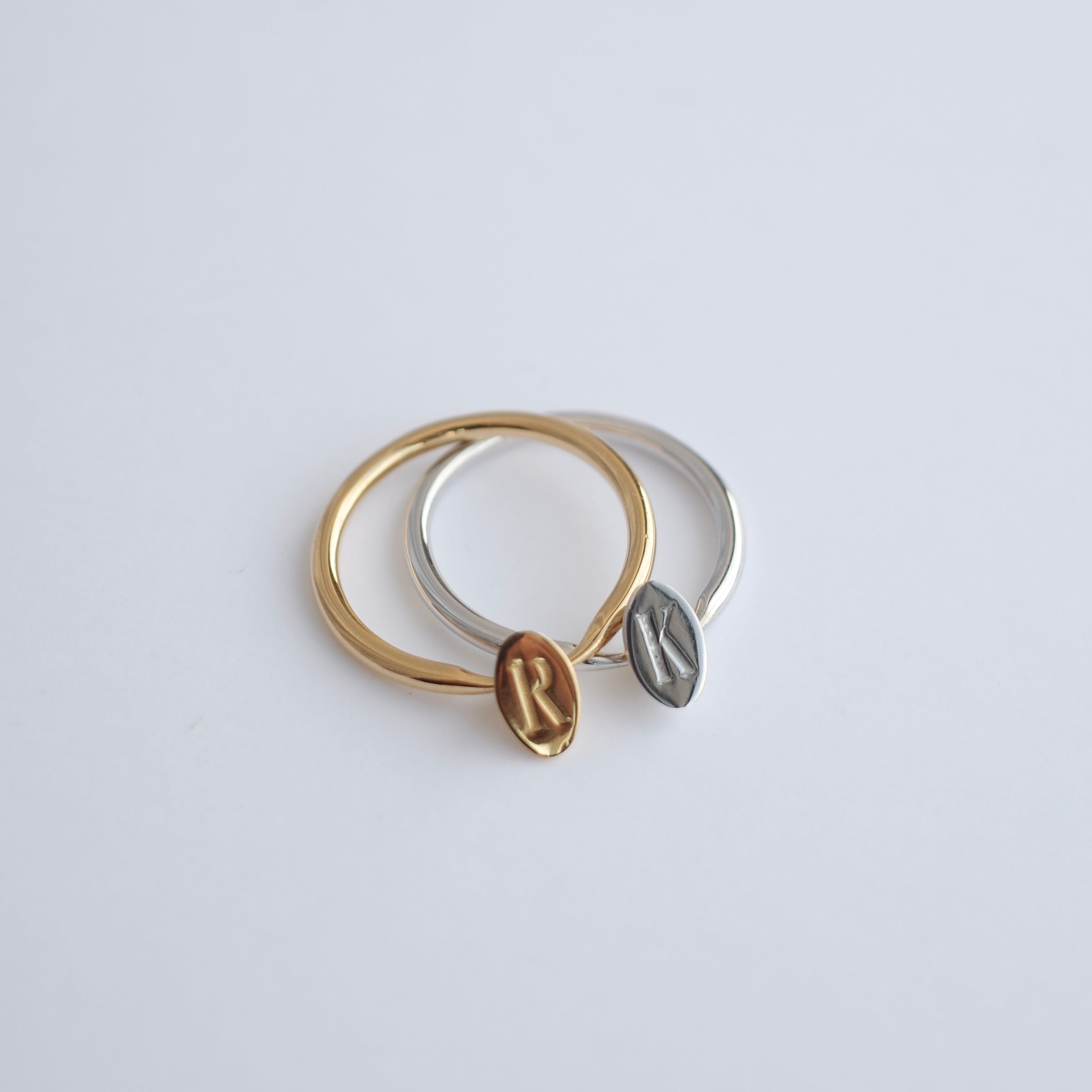 initialが刻印されたトップが動くデザインのリング。