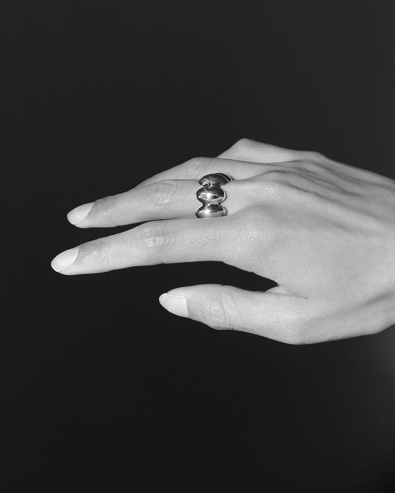 此方のリングは隙間が開いているデザインの為、普段着用されてるサイズから1号下げる事をおすすめしております。